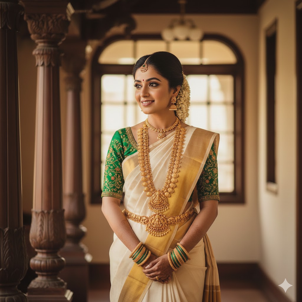 Kerala jewellery designs are known worldwide for their elegance and intricate craftsmanship. Timeless pieces like Palakka Mala, Mullamottu Mala, Kasu Mala, and Manga Mala reflect the essence of Kerala culture.